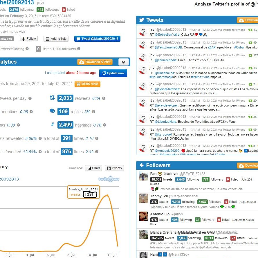 - Αναλύοντας συνολικά τα tweets που χρησιμοποιούν το hashtag τις τελευταίες μέρες, γίνεται προφανές ότι εκατοντάδες χιλιάδες έχουν δημιουργηθεί με αυτοματοποιημένο τρόπο (άρα δεν προέρχονται από πραγματικούς χρήστες). Το κείμενό τους συχνά επαναλαμβάνεται αυτούσιο, οι περισσότεροι λογαριασμοί έχουν δημιουργηθεί πρόσφατα, αρκετά έχουν τα ίδια ονόματα και στοιχεία στο προφίλ και έχουν συχνότητα δημοσίευσης που δεν μπορεί να προέρχεται από πραγματικό άνθρωπο. Αυτοί οι λογαριασμοί κατέκλυσαν τα προφίλ φιλοκουβανών χρηστών, αναγκάζοντάς τους ακόμα και να αποχωρήσουν από την πλατφόρμα, καλώντας συνέχεια επώνυμους “influencers”, ηθοποιούς, τραγουδιστές κ.ά. να τοποθετηθούν κατά της κουβανικής κυβέρνησης.