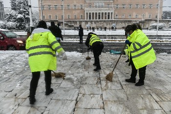εργαζόμενοι σε δήμους έβγαζαν με τσάπες το χιόνι από τους δρόμους και